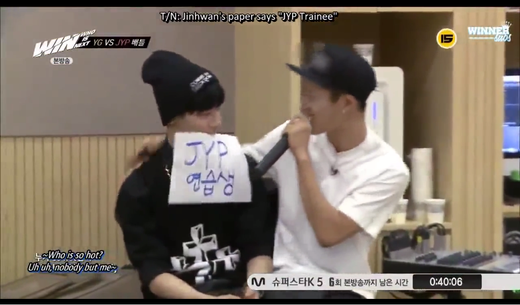 Team YG can’t decide whether to send Team A or B. so he lets the JYP trainees decide. They want to see Team A. Not going to lie, I couldn’t watch this part because I read the comments before watching it and my heart wasn’t prepared for it. Jin-Woo, who wasn’t familiar with the JYP song, forgets the lyrics in the beginning. Seung-Yoon, thankfully, catches on and covers for him and saves the performance. YG gets really angry (behind the scenes).