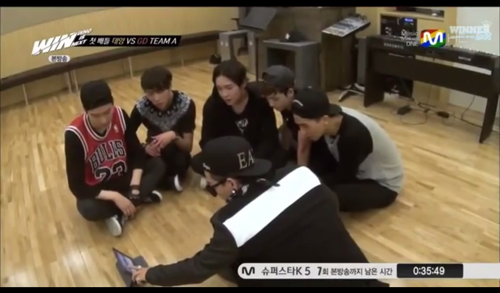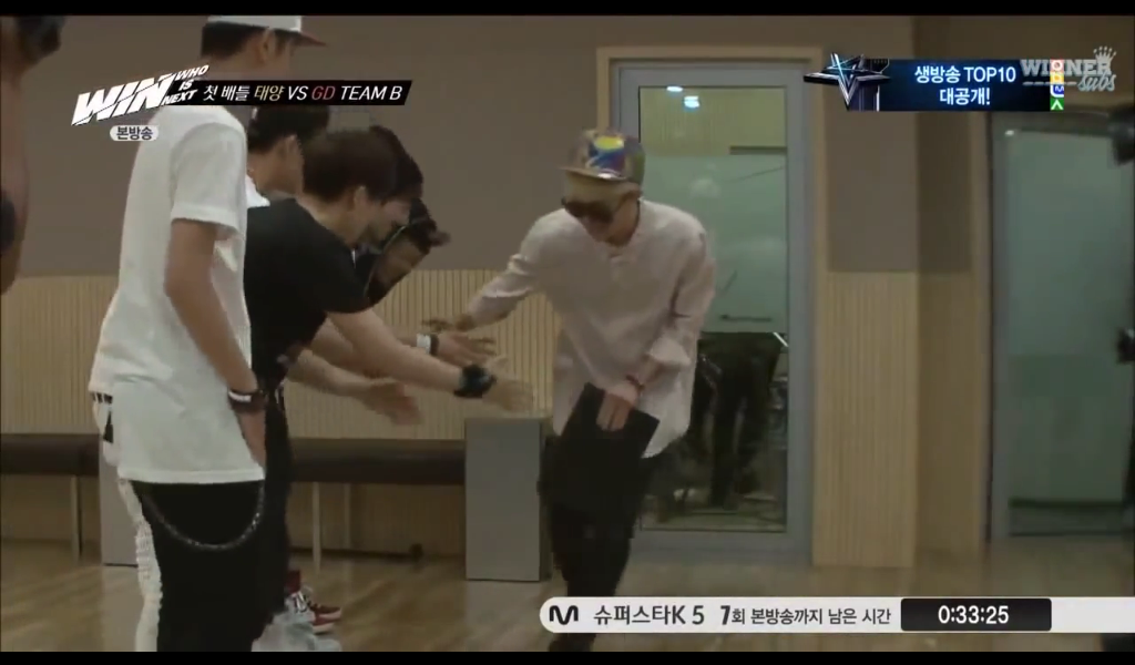 G-Dragon enters Team B’s practice room enthusiastically. His visits are similar to Taeyang’s but he focuses more on their performances. He tells helps the rapper line with their raps and gives them more pointers on swag. That sounds a little funny, huh?