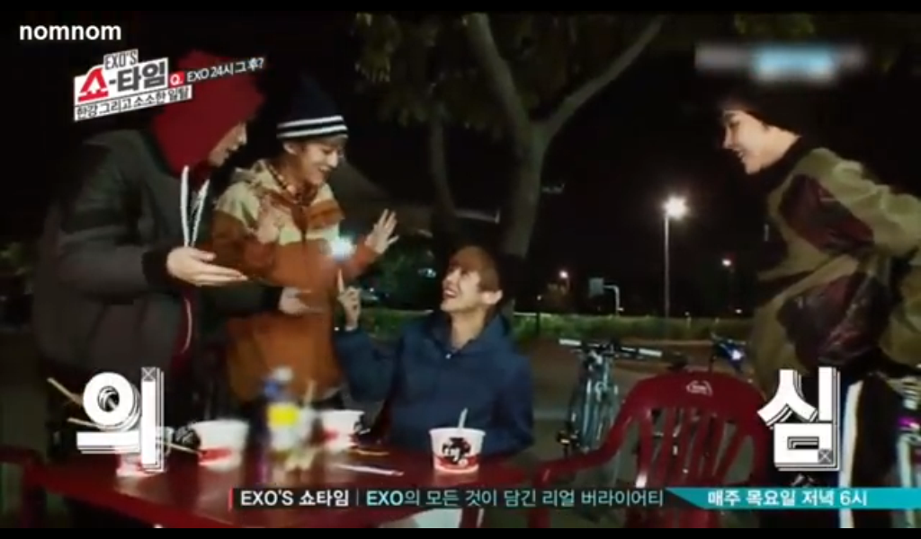 Let’s call them the F4 of the episode. These four decided to go on a bike ride to answer the question: What do you do when you don’t have a schedule? They were so cute during their ride, complaining how cold it was. I mean that’s what happens when you ride your bike at night in November honey buns. Lol at Chen wearing shorts; poor baby must have been really cold.