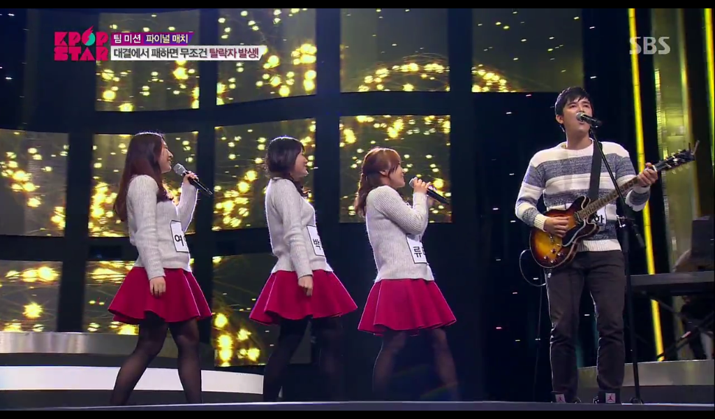 We have our divas of the show! They were put together after the first group showcase. These girls performed Amy Winehouse’s “Rehab” with so much sass that Viner Allicat would be extremely proud of them. Especially Jo Yoon Kyung, she has so much charisma it made the performance that much better. Kim Soo Hyun looked adorable in the beginning, trying to be a rebel with all the sass she has. Jang Ha Na, she’s gorgeous and sings very well. The judges have commented on how she shows a different side of her every time and it’s refreshing; it’s not awkward at all. YG commented that they were better than SuPearls. That’s a big compliment.