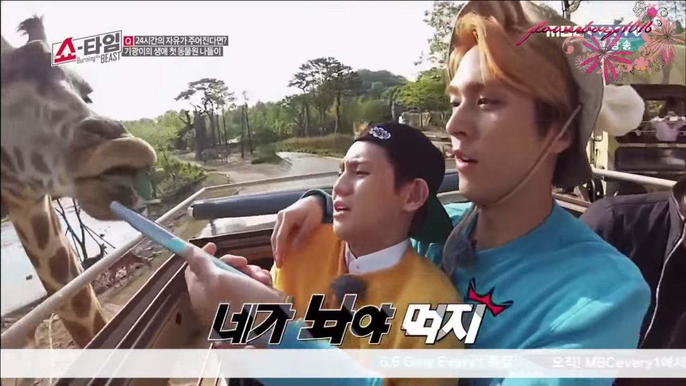 He looks like a little baby in Dong Woon’s arms, lol. Yo Seob was a little frightened when they fed the giraffes from a super close distance during their safari adventure at the zoo (Ki Kwang’s wish for the day). He was the same way with the seagulls when they were trying to feed them shrimp crackers.