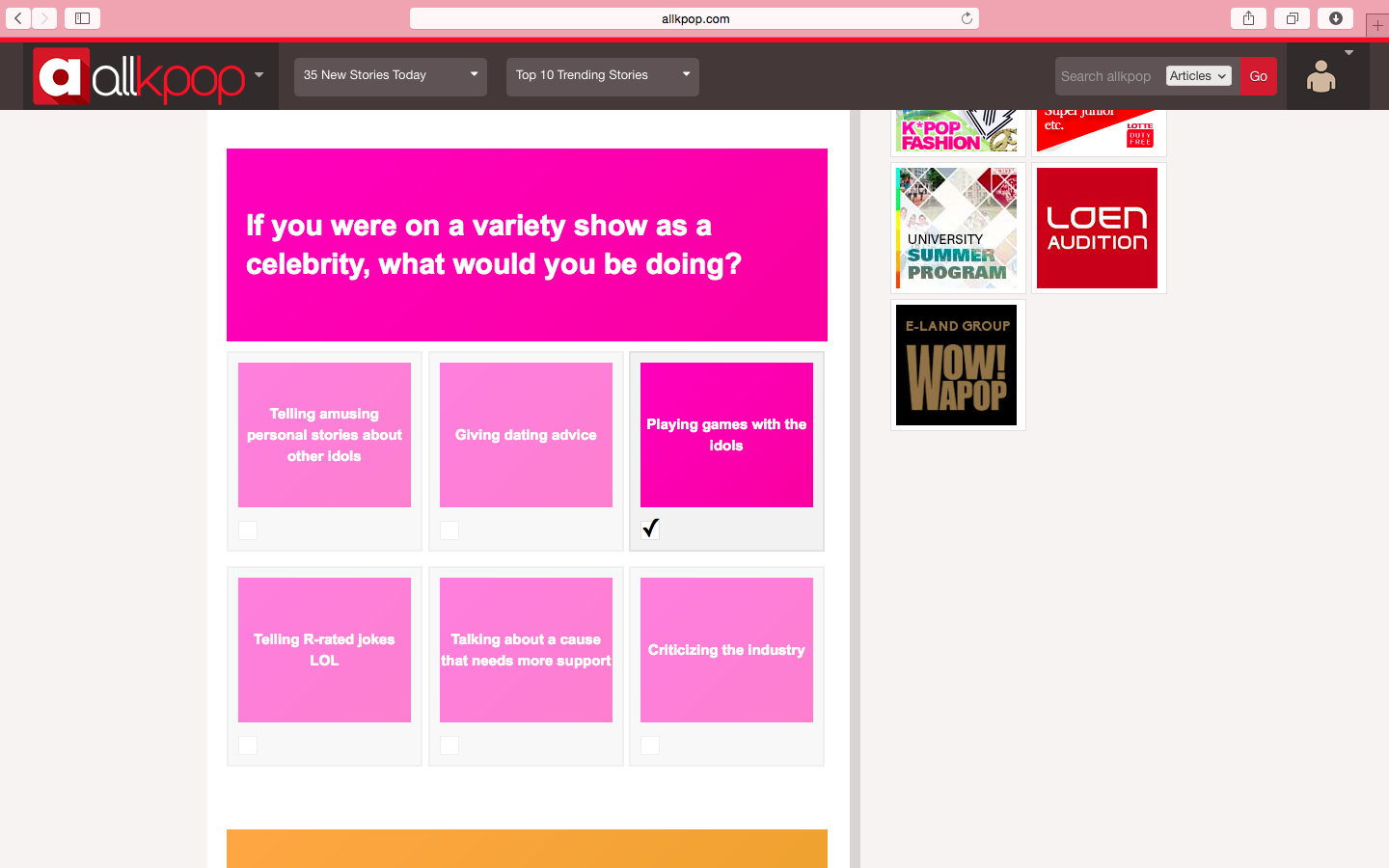 I’ve been obsessed with taking quizzes on AllKpop, to the point where I share my results with a few of my close friends and we swap answers and results. So the latest quiz is called Which male solo artist should you collaborate with? Which you can find here http://bit.ly/18oKwgS